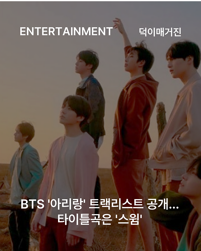 소속사 빅히트 뮤직에 따르면 방탄소년단은 4일 공식 SNS를 통해 새 앨범 ‘아리랑’의 트랙리스트를 게재했습니다. 이번 앨범에는 타이틀곡 ‘스윔(SWIM)’을 비롯해 ‘Body to Body’, ‘Hooligan’, ‘Aliens’, ‘FYA’, ‘2.0’, ‘No.29’(Interlude), ‘Merry Go Round’, ‘NORMAL’, ‘Like Animals’, ‘they don’t know ’bout us’, ‘One More Night’, ‘Please’, ‘Into the Sun’까지 총 14곡이 수록됐습니다.
