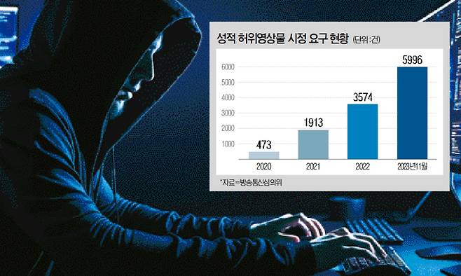 방송통신심의위원회의 통계를 보면 연예인이나 지인의 얼굴을 음란물과 합성해 유포하는 성적 허위영상물 시정 요구가 2021년 1913건에서 2023년 11월 5996건으로 2년 사이 3배 이상 뛰었다.