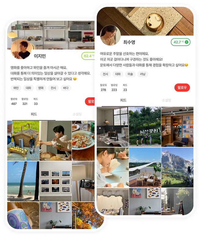 심리적 안전감을 구축한 것도 온라인 활성화의 이유입니다. 기자도 여러 커뮤니티 서비스를 이용하면서 ‘낯선’ 이와의 만남에서 불안함을 느끼기도 했는데요. 문토는 철저한 시스템을 구축해 안심시킵니다. 멤버가 각자 취향과 이력을 반영해 개인 프로필을 구성하게 한 것인데요. 소셜미디어에서처럼 다른 멤버의 프로필과 피드를 확인하고 소통할 수 있게끔 했습니다.