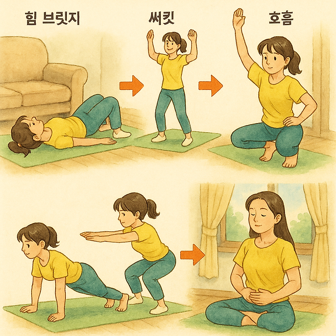 • 워밍업: 제자리 걷기 2분 → 힙 브릿지 15회