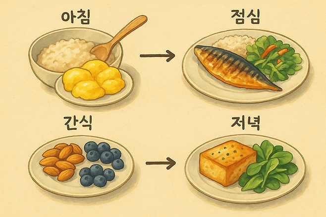 • 아침 | 귀리죽 1공기 + 달걀 스크램블 2개 | 단백질 20g 확보, 혈당 완만 ↑