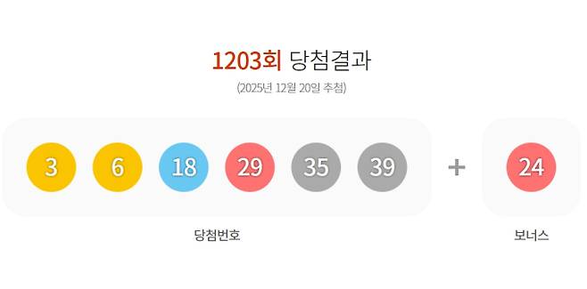1202회 복권 로또 당첨번호 '3, 6, 18, 29, 35, 39' 보너스 번호 '24'