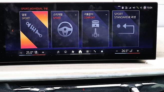 컴포트 세팅의 스티어링 휠은 적당한 무게감을 지닌다. 인테그럴 액티브 스티어링, 후륜 조향 기능도 탑재되어 있어 회전반경이 짧아진다. 일반적인 선회에서는 잘 느껴지지 않지만, 타이트한 코너나 U턴, 특히 주차할 때 크기 대비 주행이 편안한 느낌이다. 때문에 일반적인 조향감은 딱 뉴트럴 타입, 급선회가 아닌 이상 어댑티브 에어 서스펜션이 흔들림도 억제한다. 다만 급선회나 급제동에서는 물리량에 의한 피칭과 롤링을 피해갈 수 없는데, DPE 등급도 서스펜션을 스포츠 모드로 변경하면 그마저도 깔끔하게 사라진다.
