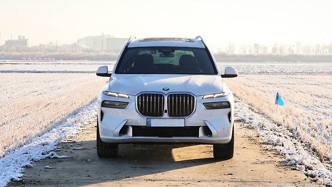 그 플래그십의 역할을 지금의 X7이 이어받고 있는 셈이다. 이번 시승차량 X7 DPE는 Design Pure Excellence의 약어로, M팩과 비교했을 때 편안하고 고급스러운 세팅을 지향한다. 가격이 아닌 성격의 차이라 이해하면 되겠다. X7은 2022년 페이스리프트와 함께 디자인이 급진적으로 변화한 바 있다. DRL과 전조등을 분할하면서 분리형 헤드램프 디자인을 택하죠. 첫인상은 이질감을 떨치기 어려웠지만, 이내 적응이 된 모습은 역동적이면서도 대담한 인상이다. 아이코닉 글로우가 적용된 대형 키드니 그릴과 함께 어디서든 강한 존재감을 펼친다.