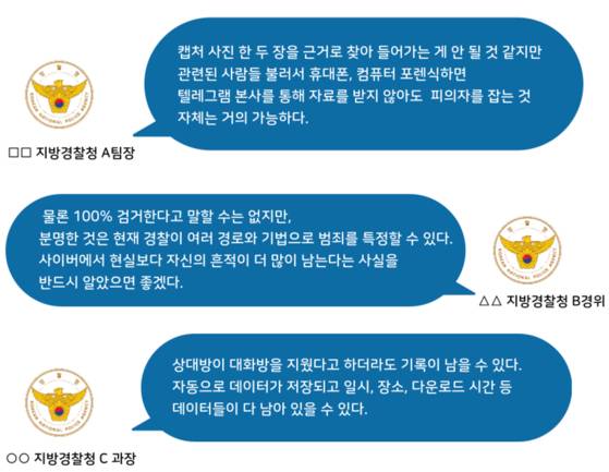 사이버수사를 담당했던 경찰 간부 A씨는 “디지털 흔적은 어떤 형태로든 남는다"면서 "텔레그램 내에서만 했다고 생각하지만 관련 조사를 하면 많은 곳에 흔적이 남아 있고 이런 단서를 역추적해 대부분 범죄 사실을 증명할 수 있었다"고 설명했습니다.