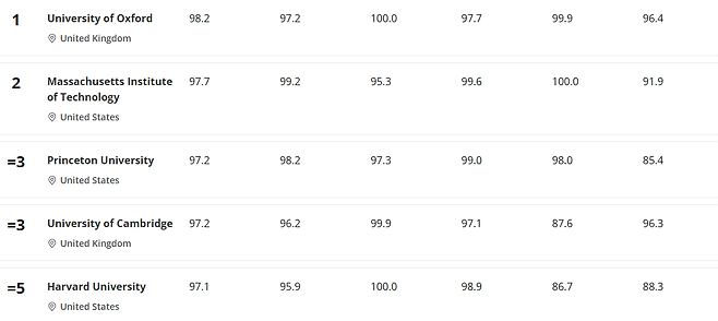 10년 연속 1위를 차지한 옥스퍼드대학교(영국)가 여전히 최강의 연구력과 학문적 평판을 자랑했고,2위는 MIT(미국), 공동 3위에는 프린스턴대(미국)와 케임브리지대(영국)가 이름을 올렸습니다.공동 5위로는 하버드대와 스탠퍼드대, 7위는 칼텍(Caltech), 8위 임페리얼칼리지런던, 9위 UC버클리,그리고 올해 처음 톱10에 진입한 예일대(미국)가 10위를 차지했습니다.