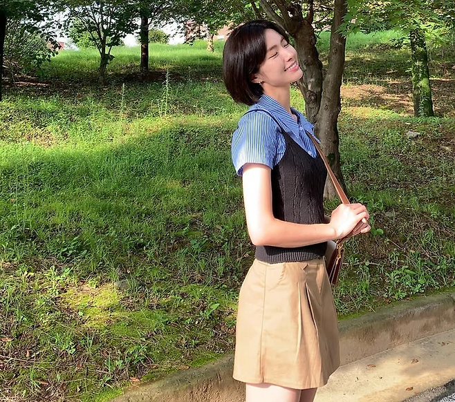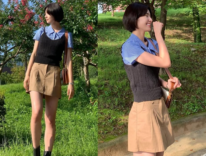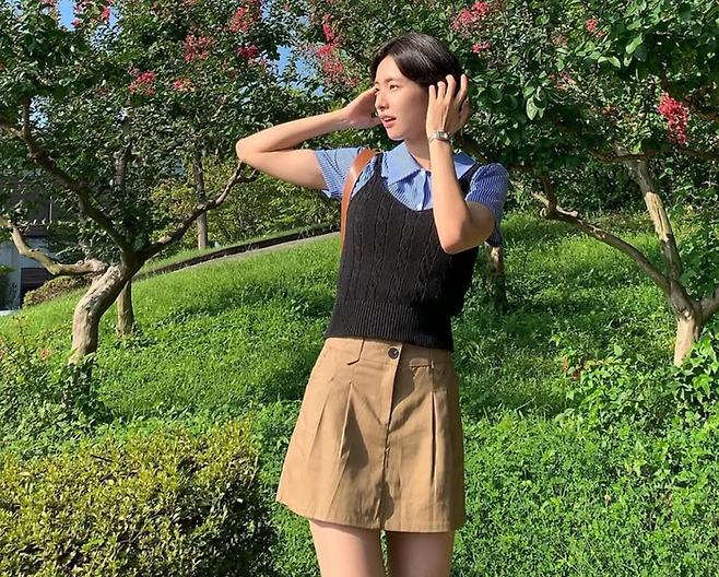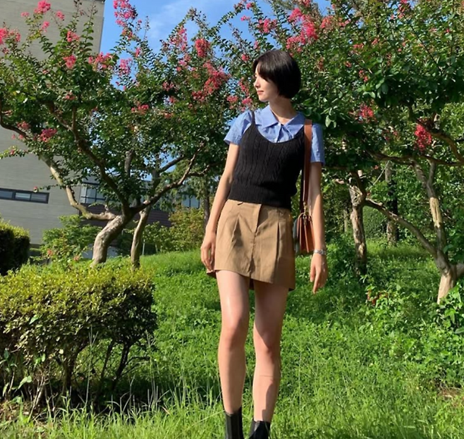 하영은 최근 블루 체크 반팔 셔츠에 네이비색 끈니트를 레이어드한 세련된 스타일을 선보였습니다. 하의는 베이지 미니 스커트를 매치해 전체적인 룩을 깔끔하게 완성했죠. 가방은 브라운 숄더백으로 클래식한 포인트를 더했습니다.