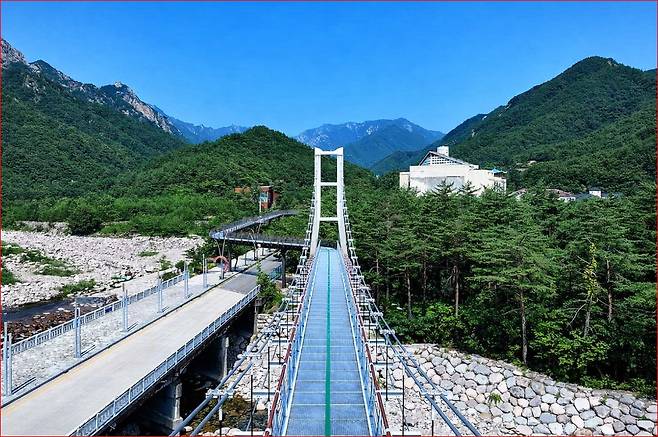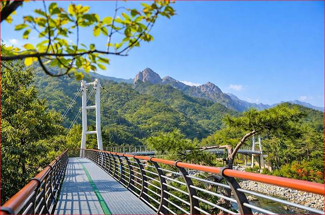 다리 한가운데서 멈춰 서서 바라보는 설악산의 능선은 그 어느 곳에서 볼 때보다 역동적이고 웅장하게 다가옵니다.