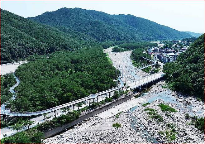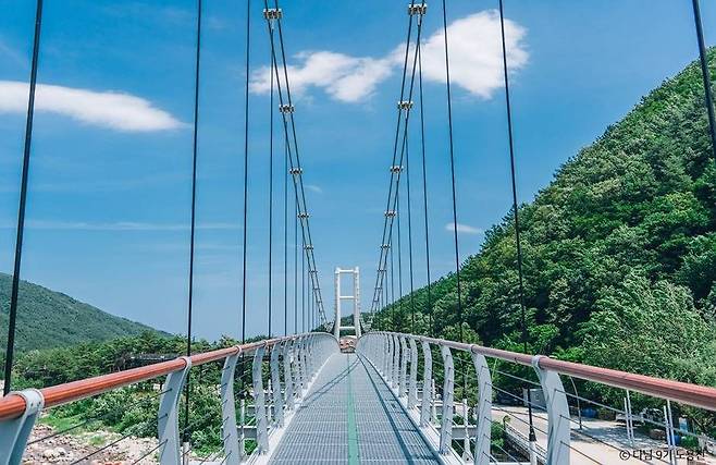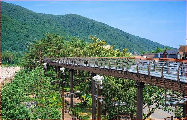 스카이워크를 지나면 하천 바닥에서 15m 높이에 설치된 98m 길이의 출렁다리를 만납니다. 성인 약 980명이 동시에 지나가도 끄떡없는 튼튼한 설계 덕분에 안심하고 걸을 수 있지만, 발걸음을 옮길 때마다 느껴지는 기분 좋은 흔들림은 산책의 재미를 배가시킵니다.