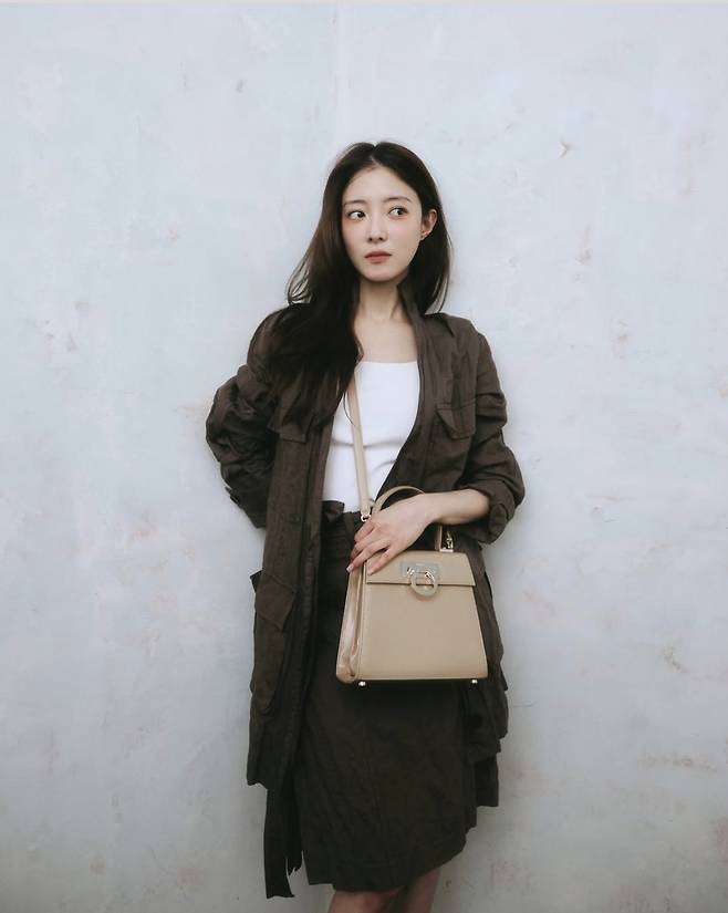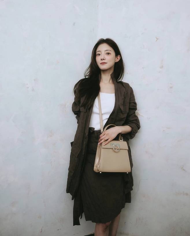 이세영은 아이보리 슬리브리스 톱에 짙은 카키빛 롱 셔츠 재킷과 같은 컬러의 하이웨이스트 스커트를 매치해 톤온톤의 안정감 있는 스타일을 선보였습니다.