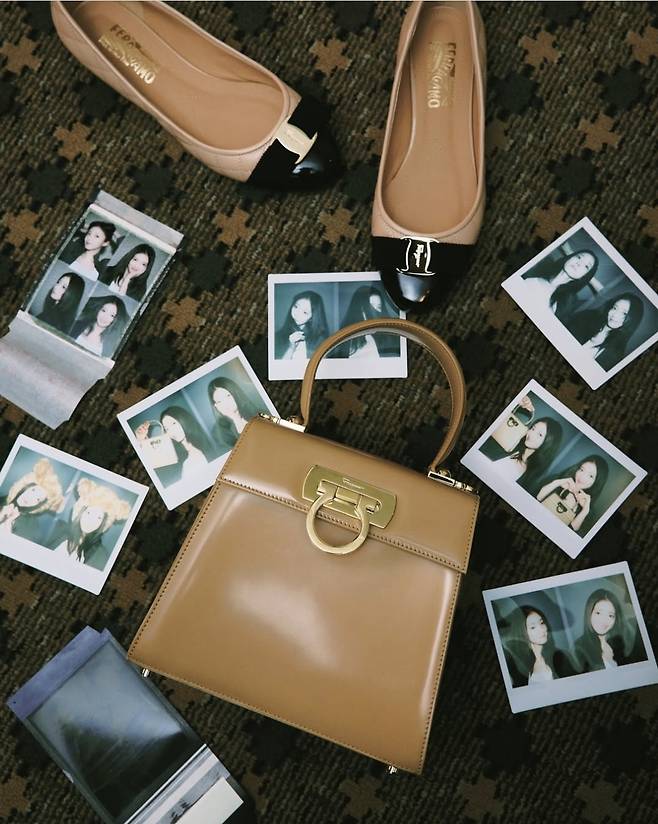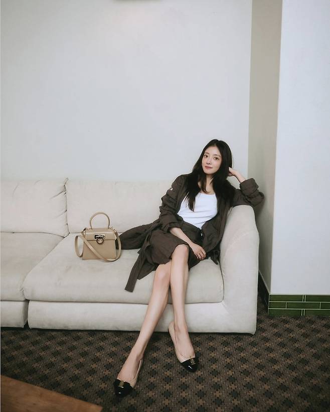 여기에 베이지 컬러의 사피아노 레더백을 포인트로 들어 정제된 여성미를 극대화했고, 블랙 캡토 장식이 돋보이는 베이지 플랫 슈즈는 룩의 완성도를 끌어올렸습니다.