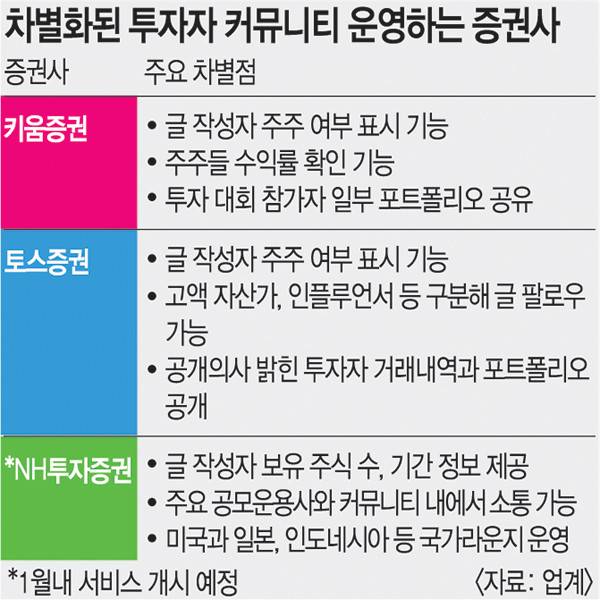네이버의 요구에 지금까지 종목 토론방 서비스를 빌려 쓰던 증권사도 자체 개발에 속도를 내고 있다. NH투자증권은 지난해 네이버 토론방 서비스를 종료하고 이달 공개를 목표로 투자자 커뮤니티를 개발 중이다. 먼저 토스·키움처럼 작성자의 주주 정보 등을 제공해 글의 신뢰도를 높이기로 했다. 또 업계에서 처음으로 국내 주요 공모자산운용사들과 직접 소통할 수 있도록 했다. 자산운용사들이 NH증권 커뮤니티에 공식 채널을 개설해 투자자들과 댓글 등을 통해 소통하는 방식이다. 상대적으로 인기가 덜한 일본과 인도네시아 증시 등도 별도 게시판을 만들어 소통할 수 있도록 돕는다.