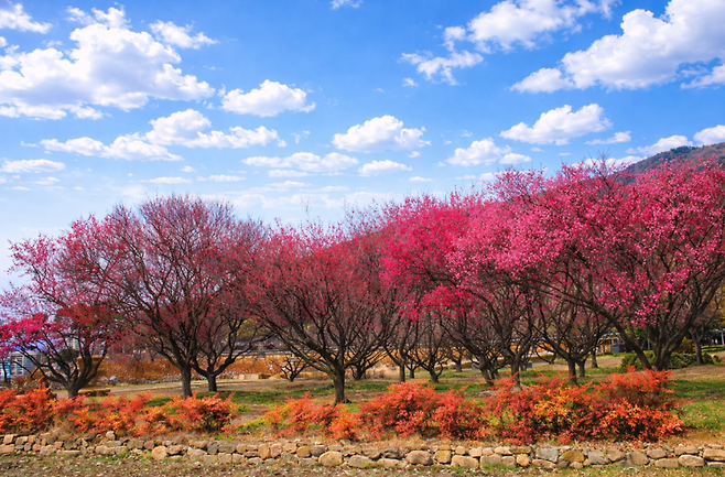 홍매화가 돌담 위로 번지기 시작하면, 그 뒤를 따라 백매화가 피어나며 분위기가 조금 더 부드러워집니다. 시간이 지나면서 색감도 자연스럽게 변해가고, 같은 장소인데도 느낌이 계속 달라져요.