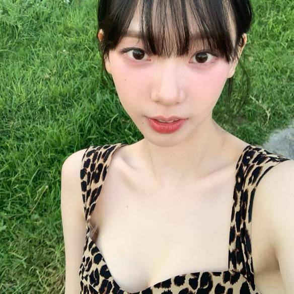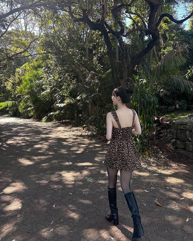 카리나가 풀밭 위에 앉아 있는 이 룩은 단연 시선을 사로잡습니다. 슬립 디자인의 레오파드 미니원피스 에 블랙 롱 부츠를 더해 섹시함과 스타일리시한 무드를 동시에 담아냈습니다. 얇은 스트랩과 짧은 기장감으로 여름의 대담함을 제대로 드러낸 스타일이군요.