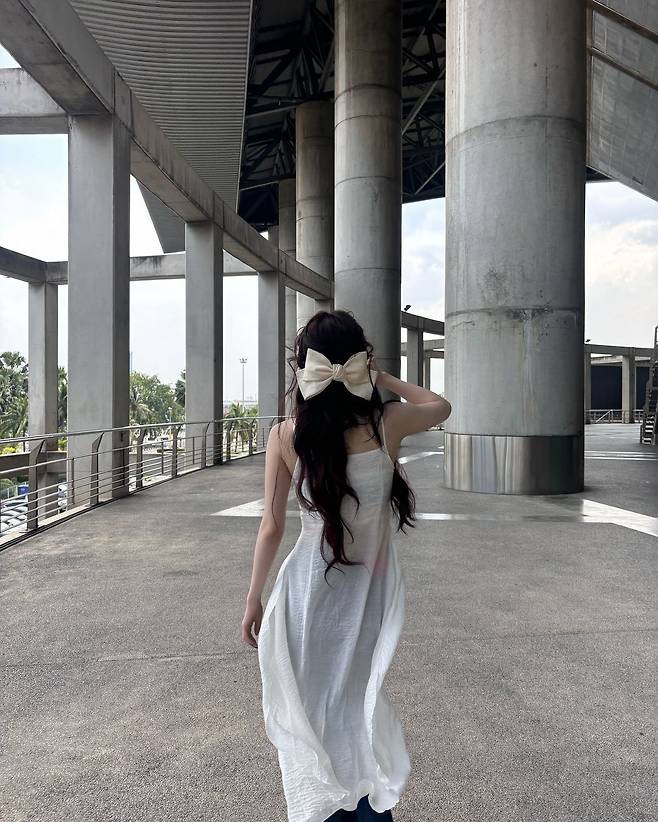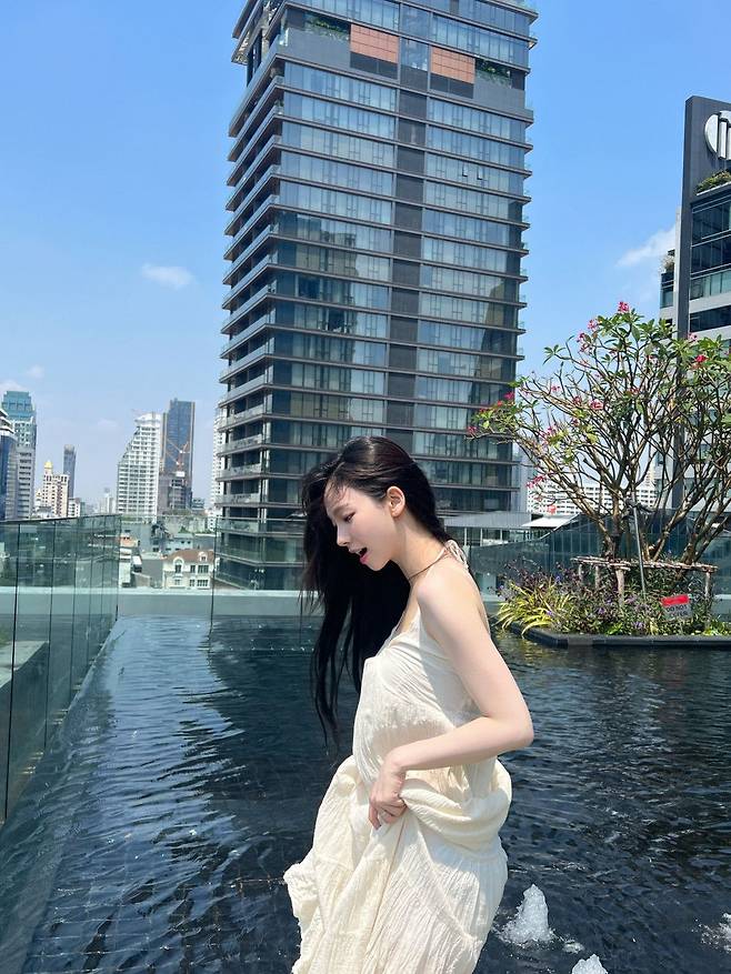 방콕의 루프탑 수영장에서 찍힌 이 사진 속 카리나는 마치 한 편의 영화 장면처럼 여유롭고 아름답습니다. 바람에 가볍게 날리는 크림 컬러 롱 원피스 는 실루엣을 자연스럽게 드러내며 우아한 분위기를 자아내죠. 카리나가 직접 방콕의 시장에서 구매했다는 이 드레스는, 사진이 공개된 후 현지에서 품절 사태까지 일으켰다는 건 덤!