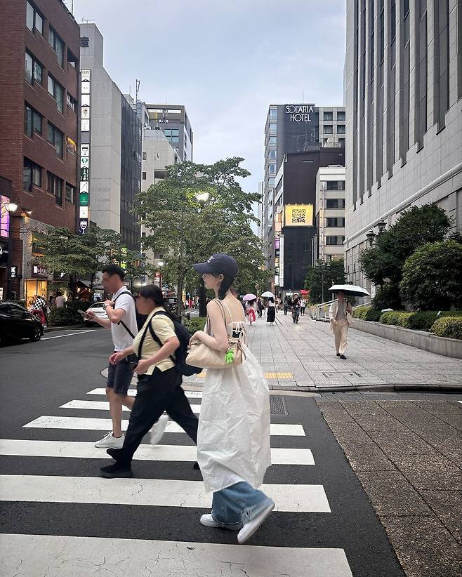 카리나가 특히 즐겨 입는 여름 스타일 중 하나는 원피스에 바지를 레이어링한 투웨이 룩 입니다. 청바지에 슬립 드레스를 겹쳐 입으면, 체형도 커버되고 스타일까지 챙길 수 있죠.