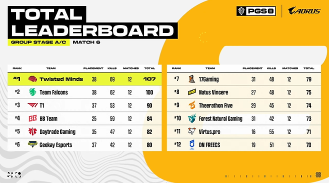 1위는 유럽 전통의 강호 트위스티드 마인즈다. 빼어난 위치 선정과 수류탄 견제, 정확한 사격 실력이 한 데 어우러지며 직전 PGS7과는 다른 경기력을 보였다. 12회의 매치에서 107점을 얻어 순위표 꼭대기에 이름을 올렸다.