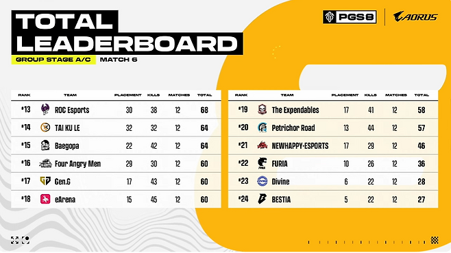 예선전 격인 그룹 스테이지에서 가장 잘한 건 T1이다. T1은 12일부터 14일까지 3일간 중국 상해에서 진행한 진행한 펍지 글로벌 시리즈(PGS) 8 그룹 스테이지에서 12회의 매치 동안 총 90점을 획득하며 3위로 결승선을 통과했다.