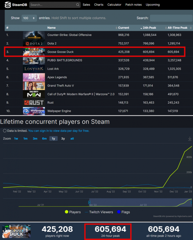 7일 온라인 게임 글로벌 디지털 플랫폼 스팀데이터베이스(SteamDB)는 스팀 최다 플레이 게임페이지를 통해 동시 접속자 60만 5694명으로 최고 동시 접속자수를 경신한 ‘구스 구스 덕’이 인기게임 순위 3위를 기록했다고 발표했다.