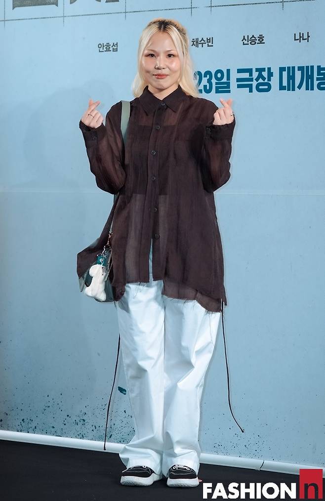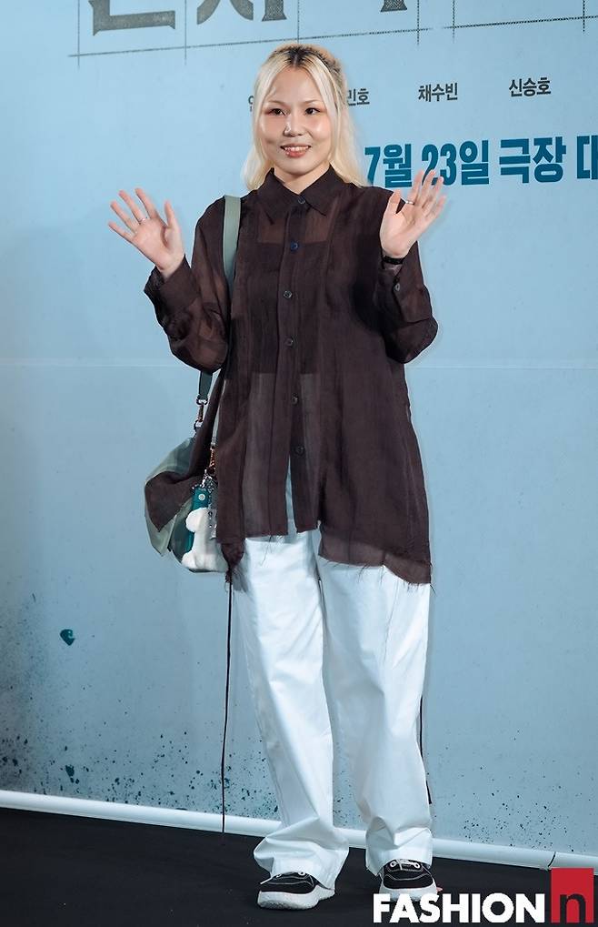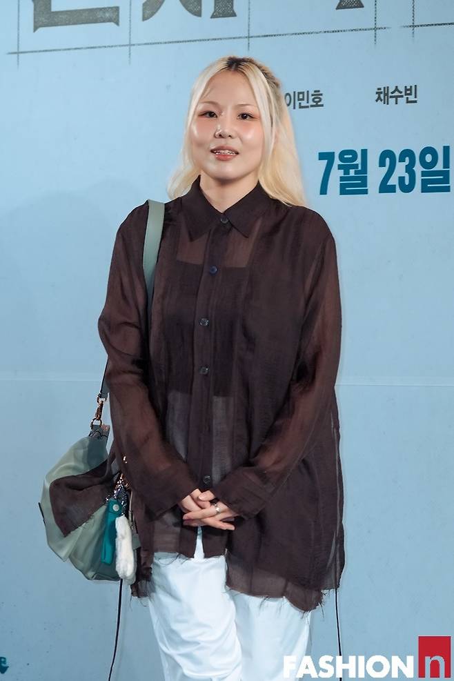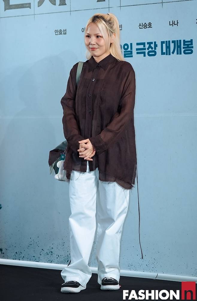 이날 알리는 은은한 비침이 있는 브라운 톤의 시스루 셔츠에 와이드 핏 화이트 배기 팬츠를 매치해 경쾌한 스타일링의 시사회룩을 완성했다.