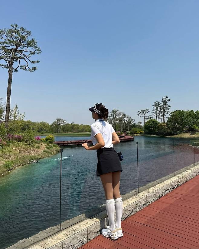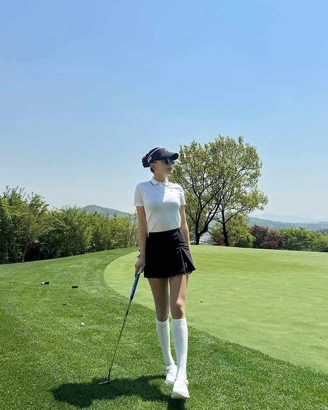 특히 눈길을 끈 부분은 니하이 길이의 화이트 삭스와 스니커즈 매치다. 무릎을 덮는 하이삭스는 다리를 더욱 길어 보이게 연출하는 동시에, 전체적인 룩에 소녀감성과 활동성을 동시에 부여했다. 이는 최근 골프웨어 트렌드 중 하나인 '영 골프 스타일'을 그대로 반영한 것으로, 전통적인 골프룩에 신선한 변주를 준 점이 인상적이다. 여기에 블랙 컬러의 썬바이저와 선글라스를 착용해 필드 위에서의 실용성과 스타일을 모두 잡았다.