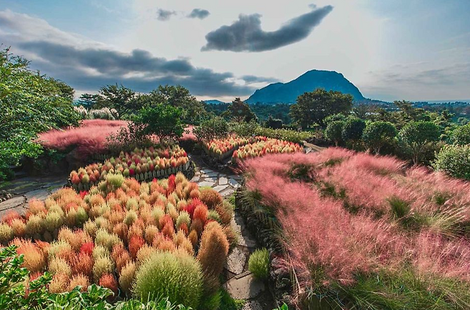 또한 핑크뮬리 사이를 걷는 산책로 옆으로는 다양한 테마의 포토존이 마련되어 있는데요, 돌담길을 배경으로 찍는 사진은 제주의 감성을 그대로 담아낼 수 있어요. 특히 산방산과 형제섬을 배경으로 찍는 사진은 이곳에서만 찍을 수 있는 특별한 뷰랍니다.