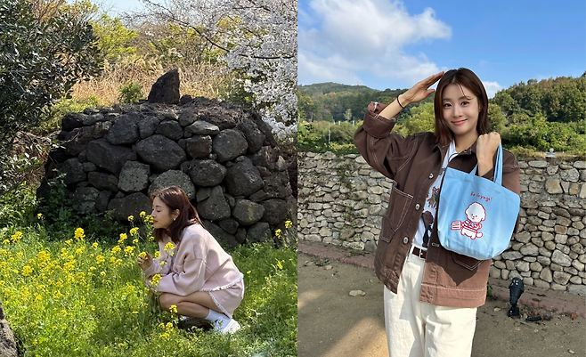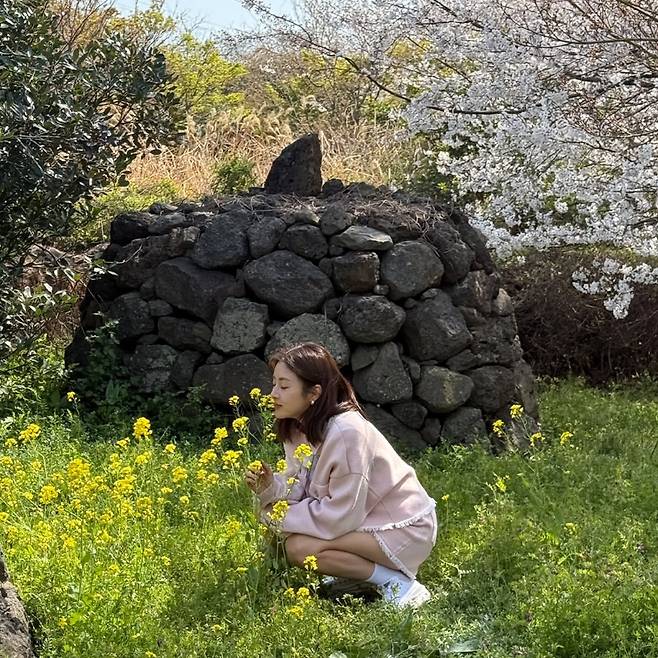 벚꽃이 만개한 배경에서는 연핑크 컬러의 오버사이즈 스웨터를 착용해 봄철 감성을 물씬 풍기고 있다. 노란 유채꽃을 들고 있는 자연스러운 포즈와 함께 편안한 캐주얼 룩을 완성했으며, 계절감 있는 컬러 매치로 로맨틱한 분위기를 극대화하고 있다.