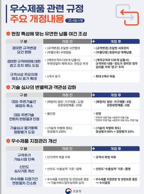 앞으로 우수조달물품의 경미한 규격 변경은 발주기관과 서면 합의만으로 가능하고, 기술심사에 정량평가 항목을 신설해 객관성을 높인다.