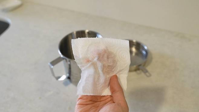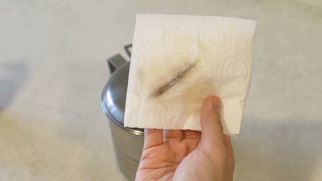 스테인레스를 새로 구입해서 식용유로 닦아 보면 사진과 같이 거뭇한 것이 나올 거에요. 이것이 바로 스테인레스 연마제인데요. 연마제는 제품의 매끄러운 표면과 광을 위해서 사용된다고 해요.