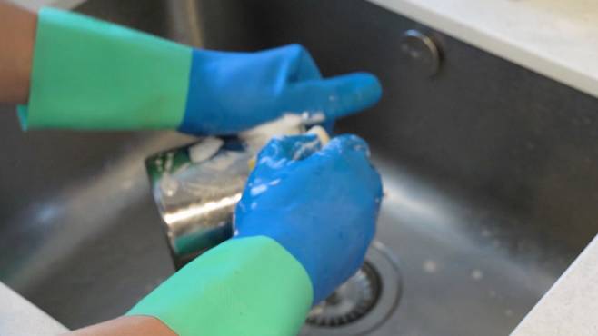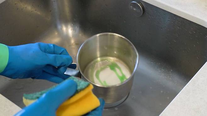 여기에 세척을 도와줄 '주방세제'도 적당량 함께 넣어 주세요. 수세미를 활용해 따듯한 물로 여러번 깨끗이 문질러 줍니다.