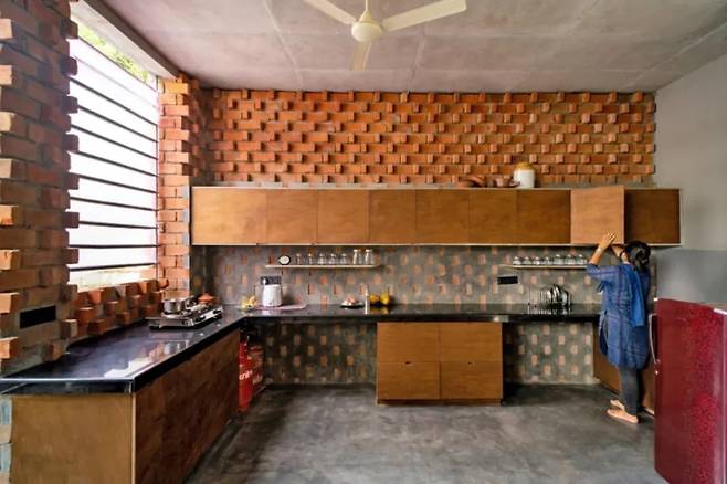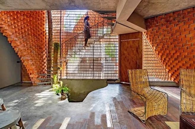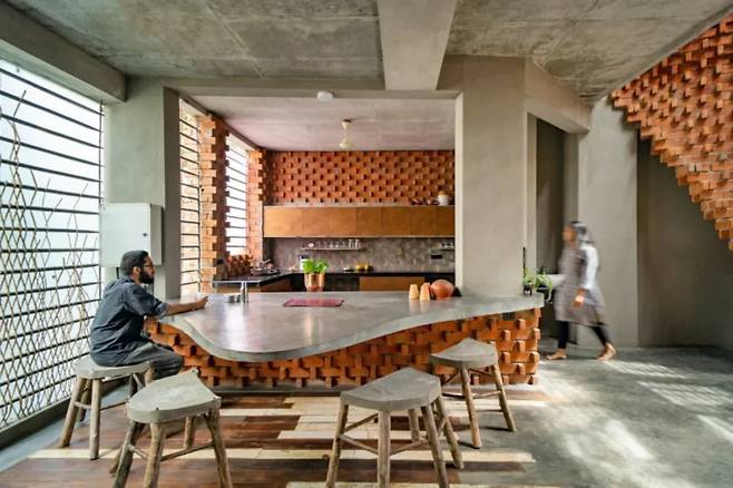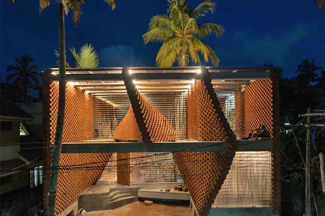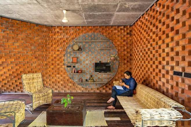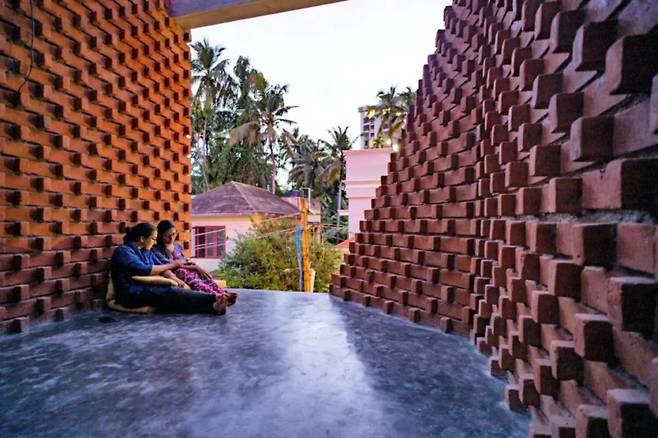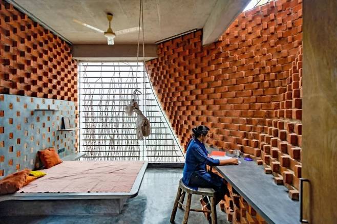 인도의 전통 가옥에서 볼 수 있는 빛과 그림자의 조화를 현대적인 감각으로 재해석한 것 같다. 벽돌의 구조는 비어 있어, 이중 구조가 뜨거운 공기를 배출하면서도 눈에 띄는 장식 효과를 제공한다.