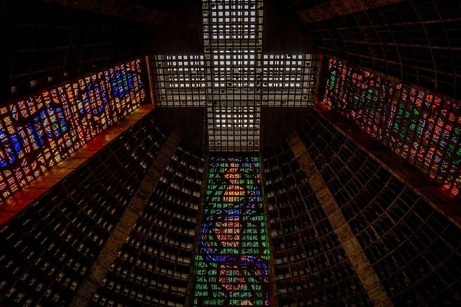 십자가의 사면을 따라 다채로운 스테인드글라스가 천장부터 아래까지 쭉 이어지는 모습은 그야말로 장관이라고 할 수 있습니다.
