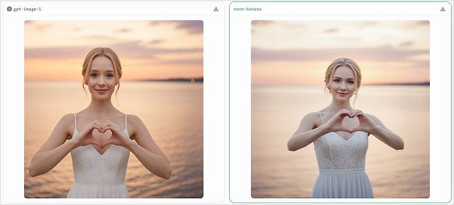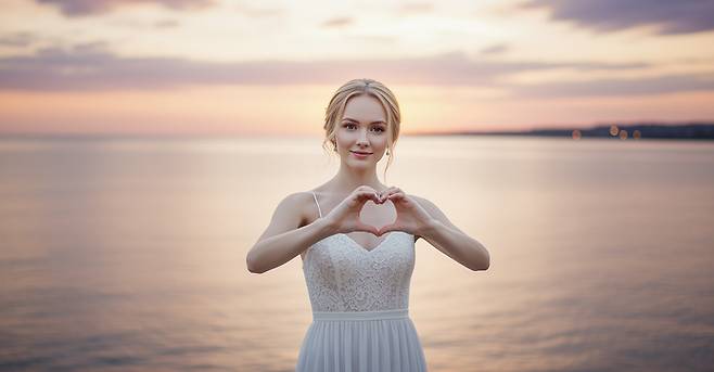 요청한 내용은 아니지만, 조명이 조금 달라져서 이미지의 분위기가 달라졌는데요. 동일 인물이라는 생각이 들 정도로 꽤 비슷했어요. 옷도 그대로고, 배경도 자연스럽게 바다로 바뀌었고요. 그다음에는 손으로 하트를 만들어달라고 요청했어요.