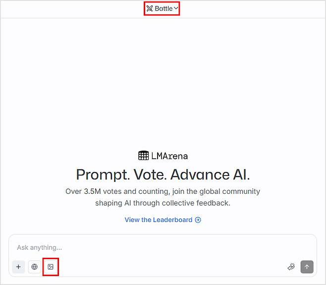 먼저 'LM아레나'에 접속해요. 그리고 상단에 Battle로 설정되어 있는지 확인한 후, 아래의 이미지 버튼을 클릭하면 프롬프트로 이미지를 생성할 수 있게 돼요.