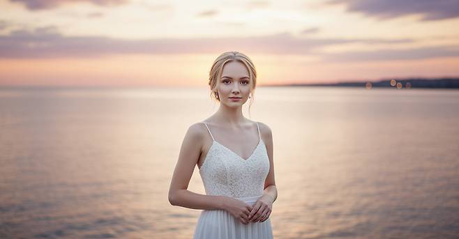 먼저 Image FX를 활용해 여성의 이미지를 만들었어요. 의도한 건 아니었지만, 몸은 측면을 향하고 있고 얼굴은 정면으로 약간 돌려서 보고 있는데요. 완벽한 정면의 얼굴을 알 순 없지만, 나노 바나나에게 얼굴을 정면으로 돌려주고, 배경을 바다로 바꿔달라고 요청했어요.