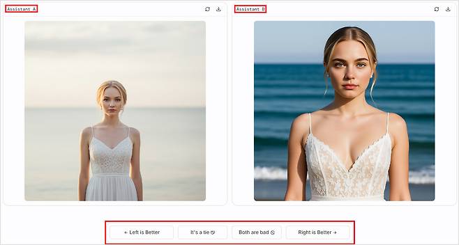 처음에는 Assistant A, B로 이미지가 생성돼요. 둘 중 뭐가 나노 바나나인 줄 모르고, 아예 없을 수도 있죠. 아래의 투표 기능을 활용해야 어떤 AI인지 알려줘요.