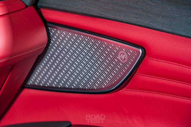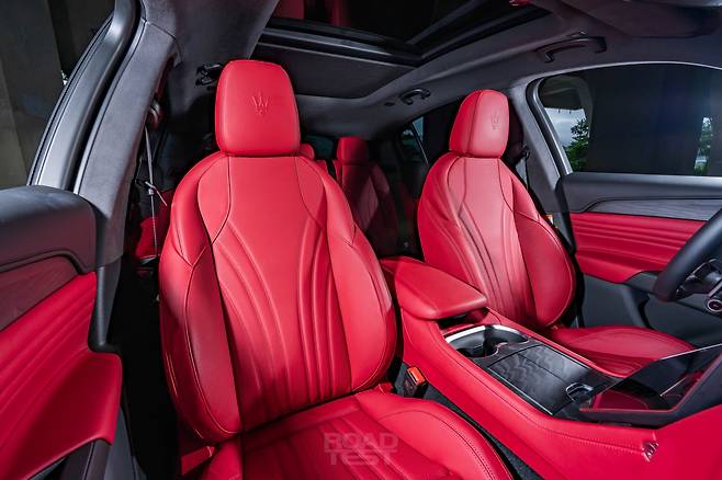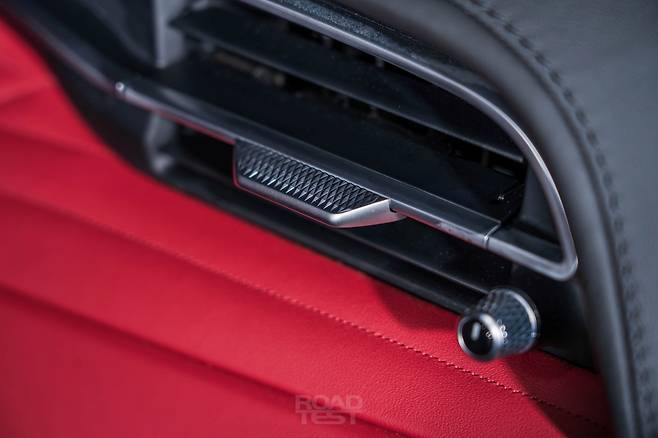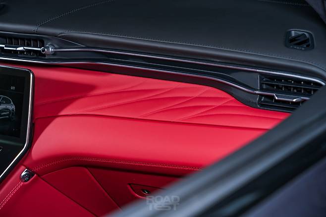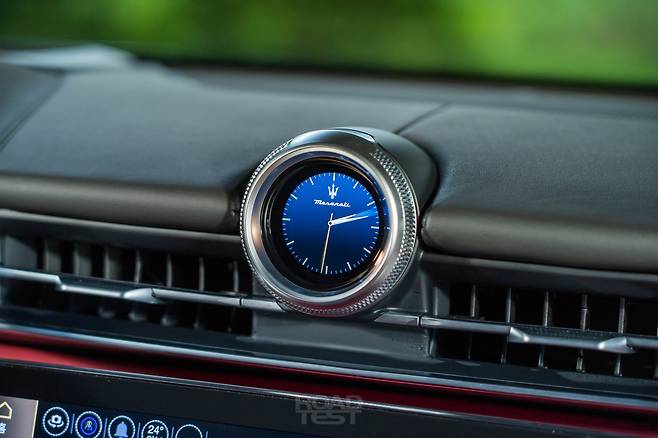 그리고 화려하다. 강렬한 로쏘(Rosso) 레드 컬러 가죽에 곡선 스티칭을 더해 우아하고 고급스러운 대시보드를 완성했다. 모니터 좌우 단추 장식과 바람 방향 조절 레버에 새긴 정교한 패턴, 금속 질감이 잘 드러나는 소너스 파베르(Sonus Faber) 스피커 커버도 인상적이다. 대시보드 위에는 디지털 시계를 얹어 과거와 미래의 만남을 표현했다. 포르쉐가 직관적인 디자인으로 운전에 전념하도록 만든다면, 마세라티는 럭셔리한 구성으로 탑승객의 감성을 건드린다.