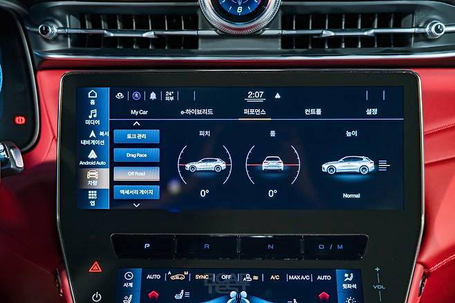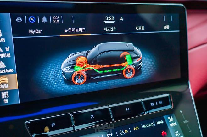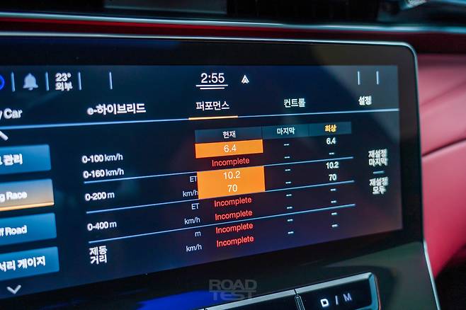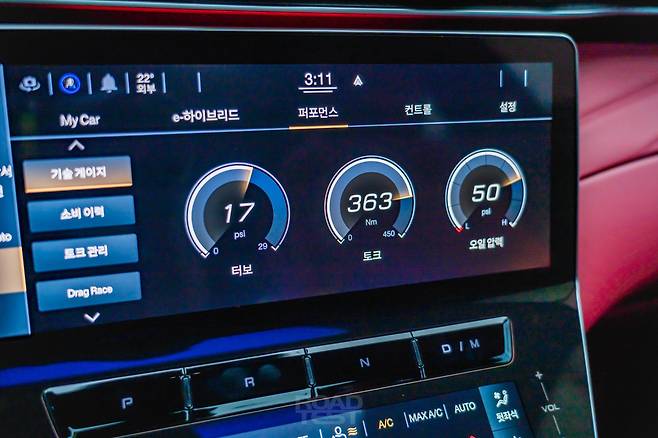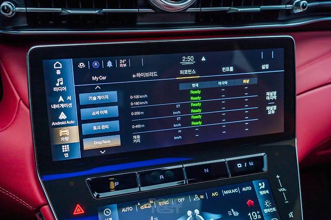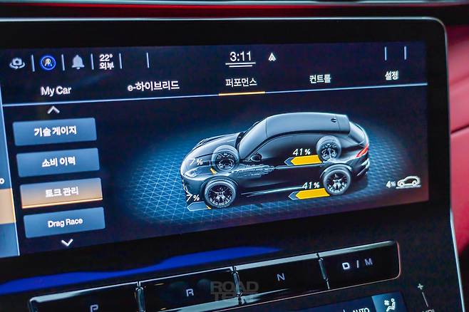 시승 당일에 비가 많이 내렸지만, 안전한 범위 내에서 최대 가속 성능도 확인해 봤다. 이때 중앙 모니터로 그래픽을 보는 맛이 쏠쏠하다. 엔진 동력과 배터리 전력 흐름, 각 바퀴에 걸리는 힘의 비중을 실시간으로 나타낸다. 정지 상태에서 ‘Drag Race’ 메뉴를 누르면 시속 100㎞까지의 가속 시간도 측정할 수 있다. 모든 항목에 ‘Ready’ 표시가 떴을 때 출발하면 된다.
