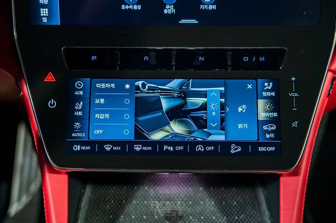 아래는 공조장치 전용 화면이다. 온도와 바람 세기, 시트 열선 및 통풍 기능까지 전부 넣었다. 그 양쪽에 헤드램프와 대시보드 시계 화면 전환, 앰비언트 라이트, 에어 서스펜션 높이 조절 기능을 덧붙였다. 아이콘이 빽빽하게 들어섰지만 배치가 간단해 적응하기 쉽다. 단점 하나만 언급하자면, 비상등 버튼마저 터치 방식이라 운전 도중에 누르기가 어렵다.