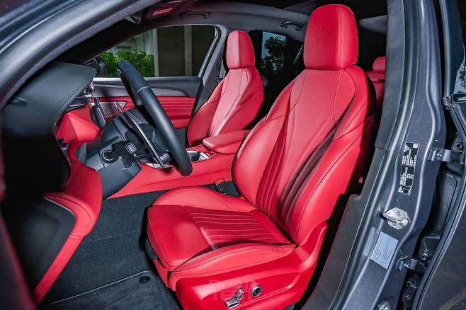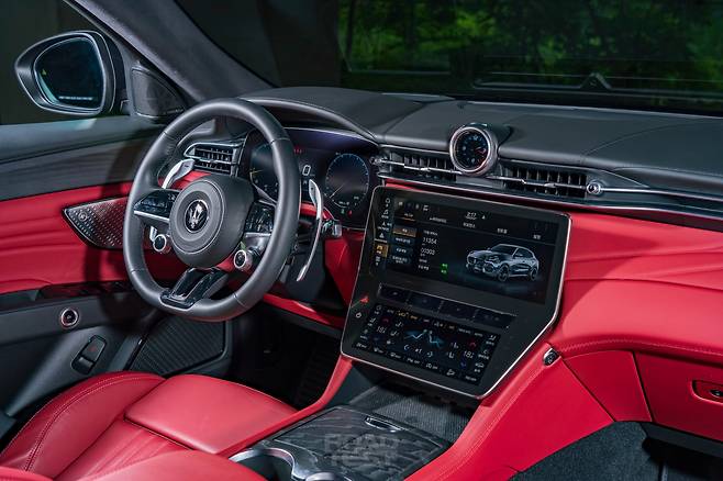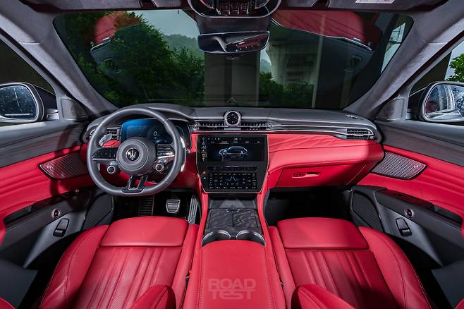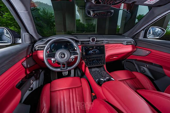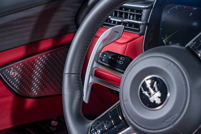 마세라티의 실내 디자인이 이 정도였던가? 문을 열자마자 감탄했다. 아날로그 계기판과 저렴한 플라스틱 버튼 등 기존 인테리어에서 아쉬웠던 점이 몽땅 사라졌다. 이제 12.3인치 디지털 계기판이 들어가며, 중앙 디스플레이 패널은 12.3인치 및 8.8인치 모니터를 위아래로 쌓아 만들었다. 두 화면 사이엔 변속 버튼을 가로로 배치했다. 센터콘솔에서 기어 레버를 빼면서 수납공간을 더 크게 확보할 수 있었다.