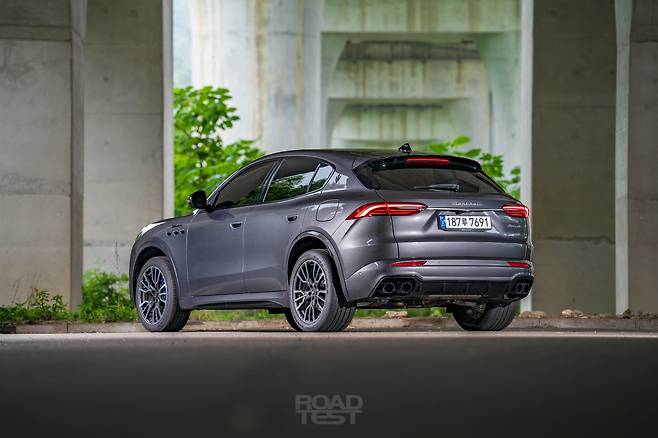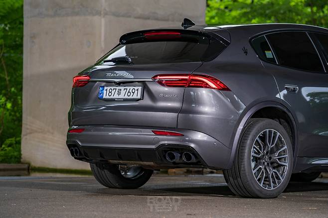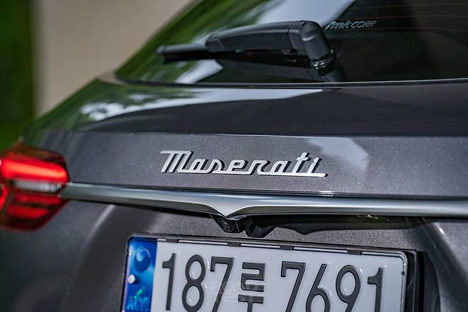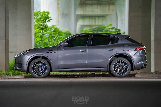 다소 껑충한 얼굴과 다르게, 옆과 뒷모습은 상당히 차분하다. 포르쉐 마칸 S보다 44㎜ 높지만(1665㎜) 길이(4,850㎜)와 휠베이스(2,901)㎜가 각각 124, 94㎜씩 길어 비례가 낮고 늘씬하다. 부드럽게 흐르는 캐릭터라인과 완만하게 떨어지는 루프, 팽팽하게 부푼 리어 펜더로 마세라티만의 우아함을 뽐낸다. 더욱 매끄러운 표면을 위해 매립식 도어 핸들도 달았다.