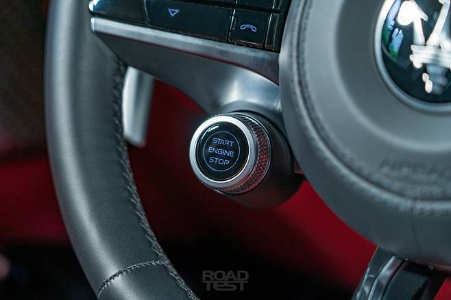 스티어링 휠에는 다양한 버튼들이 모였다. 가장 눈에 띄는 부분은 시동 스위치. 원래 마세라티는 포르쉐처럼 시동 버튼을 운전대 왼쪽 대시보드에 달았다. 드라이버가 차로 뛰어들어 출발했던 과거 르망 내구레이스 규정의 영향 때문이다. 키 박스를 왼쪽에 두면 왼손으로 시동을 걸면서 오른손으로 1단 기어를 넣어 비교적 빠르게 출발할 수 있었다. 이제는 운전대 위로 자리를 옮겨 ‘왼쪽’이라는 전통에 레이스카 분위기까지 더했다.