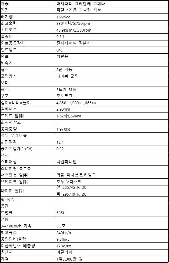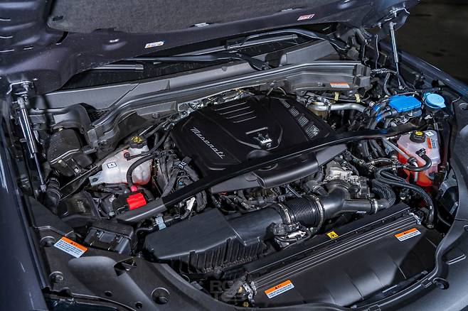 그레칼레는 두 가지 엔진을 쓴다. 고성능 버전 트로페오는 530마력 V6 3.0L 가솔린 트윈터보 네튜노(Nettuno) 엔진을 쓴다. 정지 상태에서 시속 100㎞ 가속을 3.8초 만에 해치울 만큼 강력하다. 시승차인 모데나에는 직렬 4기통 2.0L 가솔린 터보 엔진을 얹었다. 기본형인 GT 트림과 공유하는데, 최고출력을 30마력 더 높은 330마력으로 조율했다. 최대토크는 45.9㎏·m.