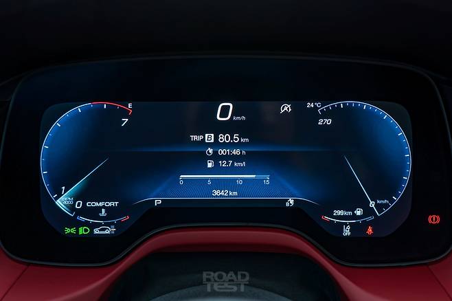 연비도 생각보다 훌륭하다. 강원도 춘천에서 서울 은평구까지 약 81㎞를 달린 결과, 트립컴퓨터는 1L당 12.7㎞의 연비를 기록했다. 도심 속 8㎞ 구간만 빼면 전부 시속 70~100㎞ 사이로 달렸을 만큼 교통 흐름은 원활했다. 최대한 높은 기어를 연결하는 변속기와 48V 마일드 하이브리드 시스템이 함께 달성한 기록이다.