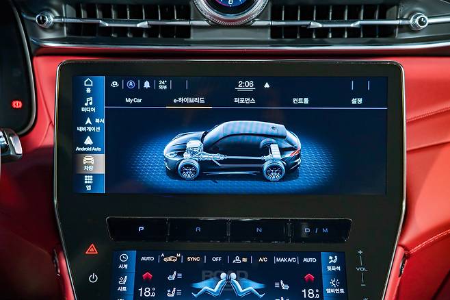 두 모니터의 역할은 명확하다. 상단 모니터는 ‘마세라티 인텔리전트 어시스턴트(MIA) 멀티미디어 시스템’을 품어 내비게이션과 차의 정보 등을 띄운다. 무선 애플 카플레이와 안드로이드 오토를 지원하며, 주행 중 동력 전달 및 배분 과정과 터보·오일 압력, 순간 토크 등을 확인할 수 있다. 운영체제는 안드로이드 오토모티브. 1,500만 화소의 뛰어난 해상도도 장점이다.