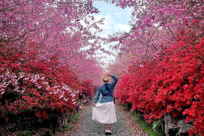 특히 이곳의 하이라이트는 단연 연산홍입니다. 사찰 내부로 들어서는 순간부터 형형색색의 봄꽃 터널이 맞이해줘요. 강진 남미륵사의 연산홍은 흔히 보던 연한 핑크색과는 차원이 다른 진한 선홍색을 띱니다.