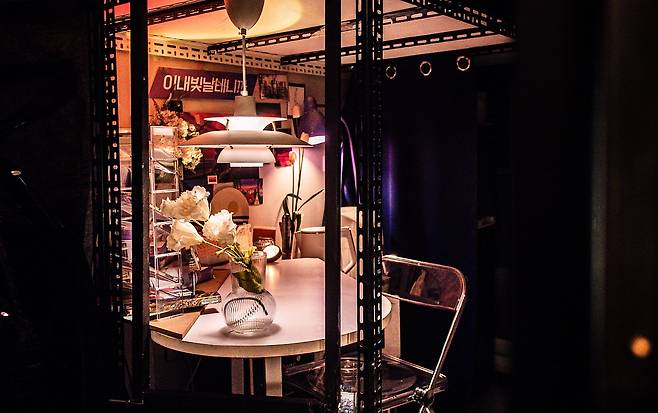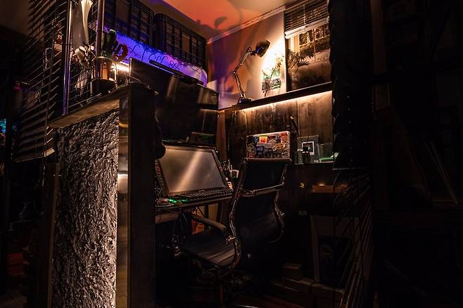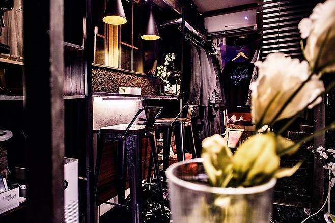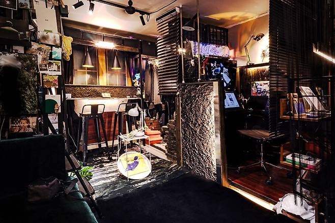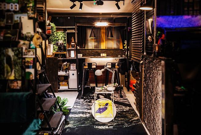 거실 공간의 반대편에는 바 테이블이 한가운데에 놓여있는데요. 덕분에 바에 놀러 온 것 같으면서도, 전체적으로 각기 다른 높이의 선반이 함께 눈에 들어와 더욱 인더스트리얼한 스타일로 보이는 것 같아요.