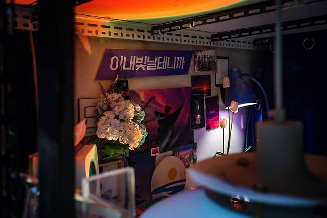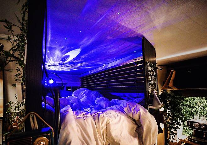 숙면을 취해야 하는 곳인 만큼 침대 옆에는 저번 인테리어에 사용하고 남은 블라인드를 달아주었어요. 덕분에 침대 무드 등의 빛이 바깥으로 빠져나가지 않아 '침실만의 독특한 분위기'가 더 강조되는 인테리어가 완성되었는데요. 개인적으로 침실은 저만의 포근한 안전 공간이라고 생각하고 있어요.
