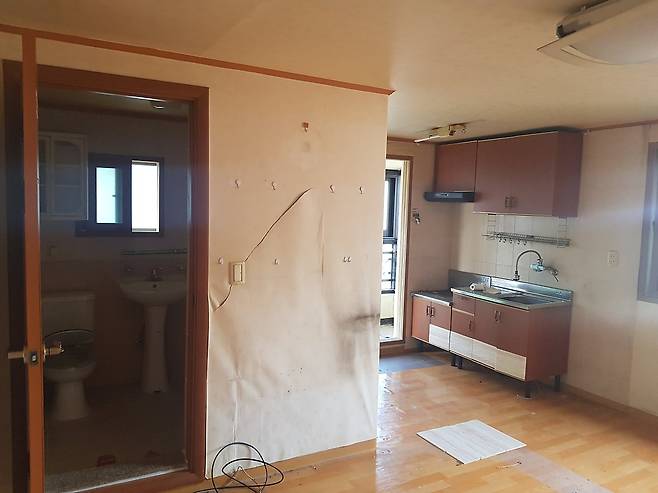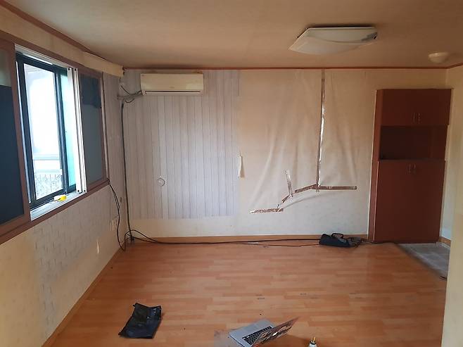이 집은 이전 임차인이 10년 가까이 살고 간 방이었어요. 사진에서 보이는 것처럼 굉장히 낡고, 벽지도 찢겨 있는 상태였습니다. 여기에 임대인 분께서 도배와 장판만 새로 해주셨고, 그 외의 옵션은 아무것도 없어서 제가 전부 다 바꾸고 채워 넣었어요.