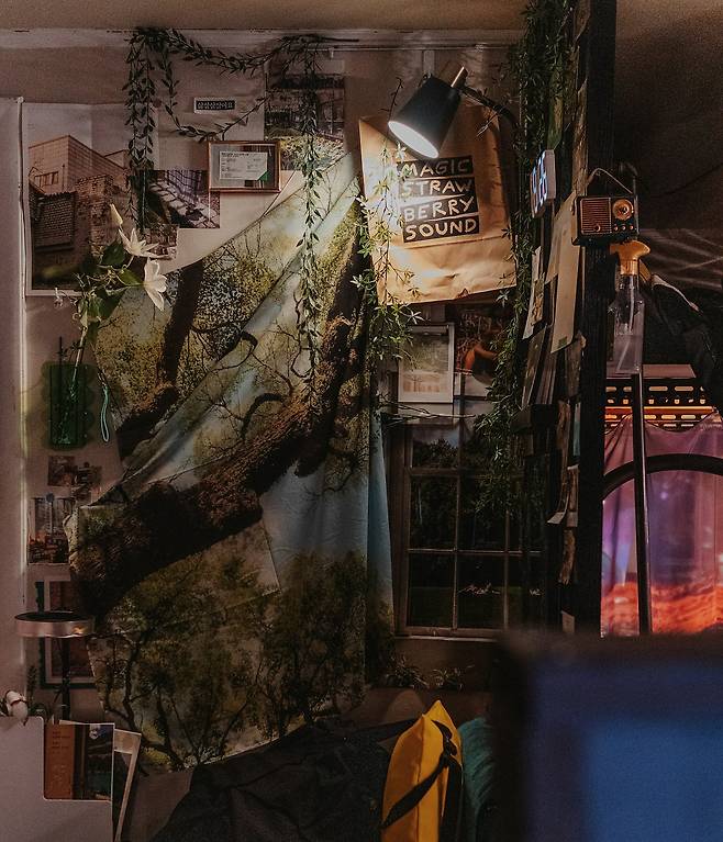 거실의 메인 스팟은 초록색 벨벳 커버 소파와 그 위쪽 벽이에요. 깊은 톤의 소파 위로 엽서와 패브릭 커튼을 달아, 누구나 이곳을 보면 제가 지향하는 스타일이나 방을 어떤 느낌으로 꾸몄는지 한 번에 느낄 수 있도록 했어요.